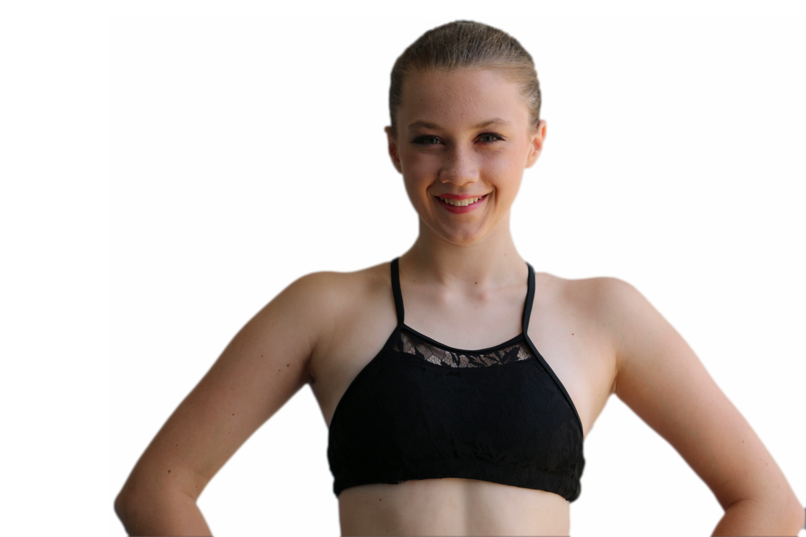 This gorgeous black lycra crop top has a black lace overlay on the front bodice. The fancy double straps cross at the back adding to the classy look of this top. Wear it to class or as a performance piece with harem pants or a lyrical skirt.