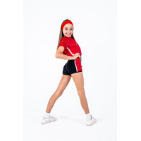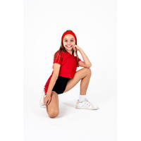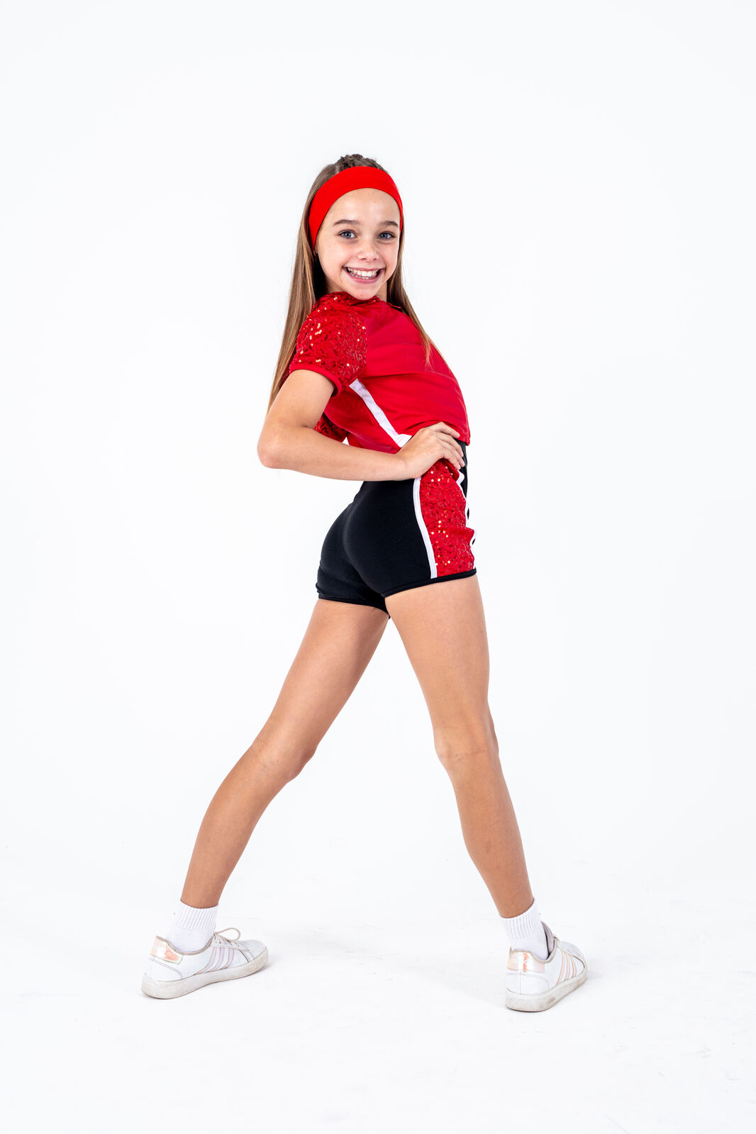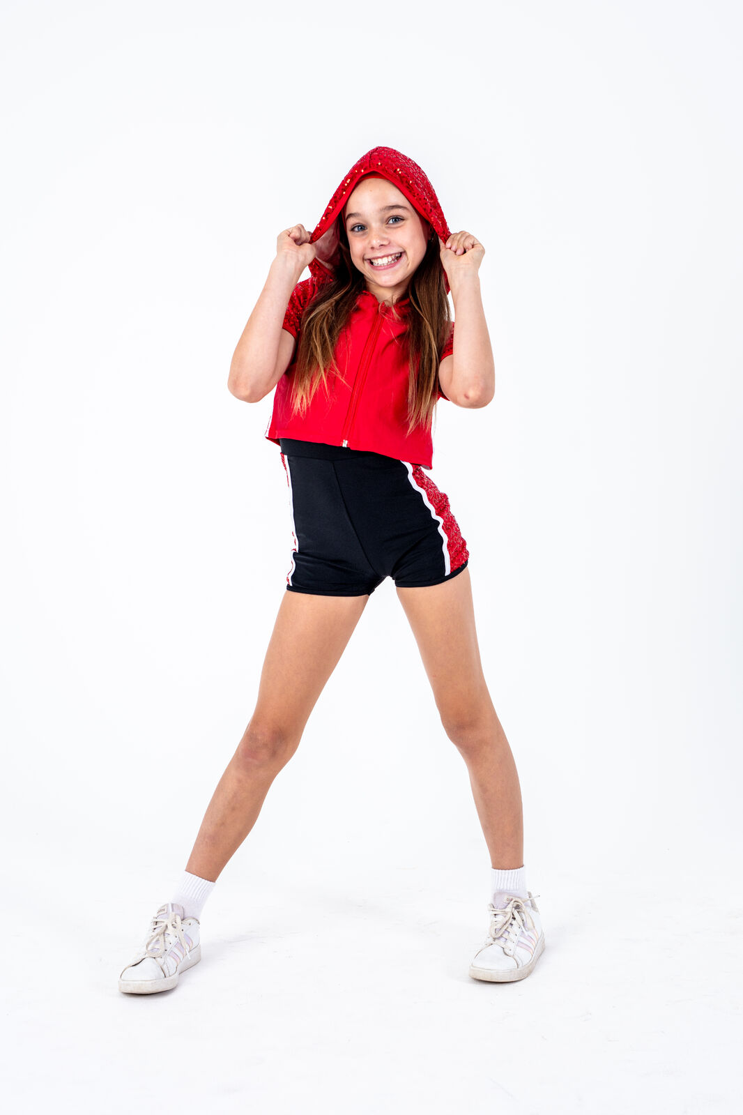 This 2-piece hip hop set is the ultimate statement piece. It features a unitard with double straps and sequin detailing on the shorts for a bold, eye-catching look. Paired with a cropped zip up jacket with a sequin hood and sequin sleeves, this dynamic ensemble is perfect for making a high-energy impact on stage. Includes a headband.