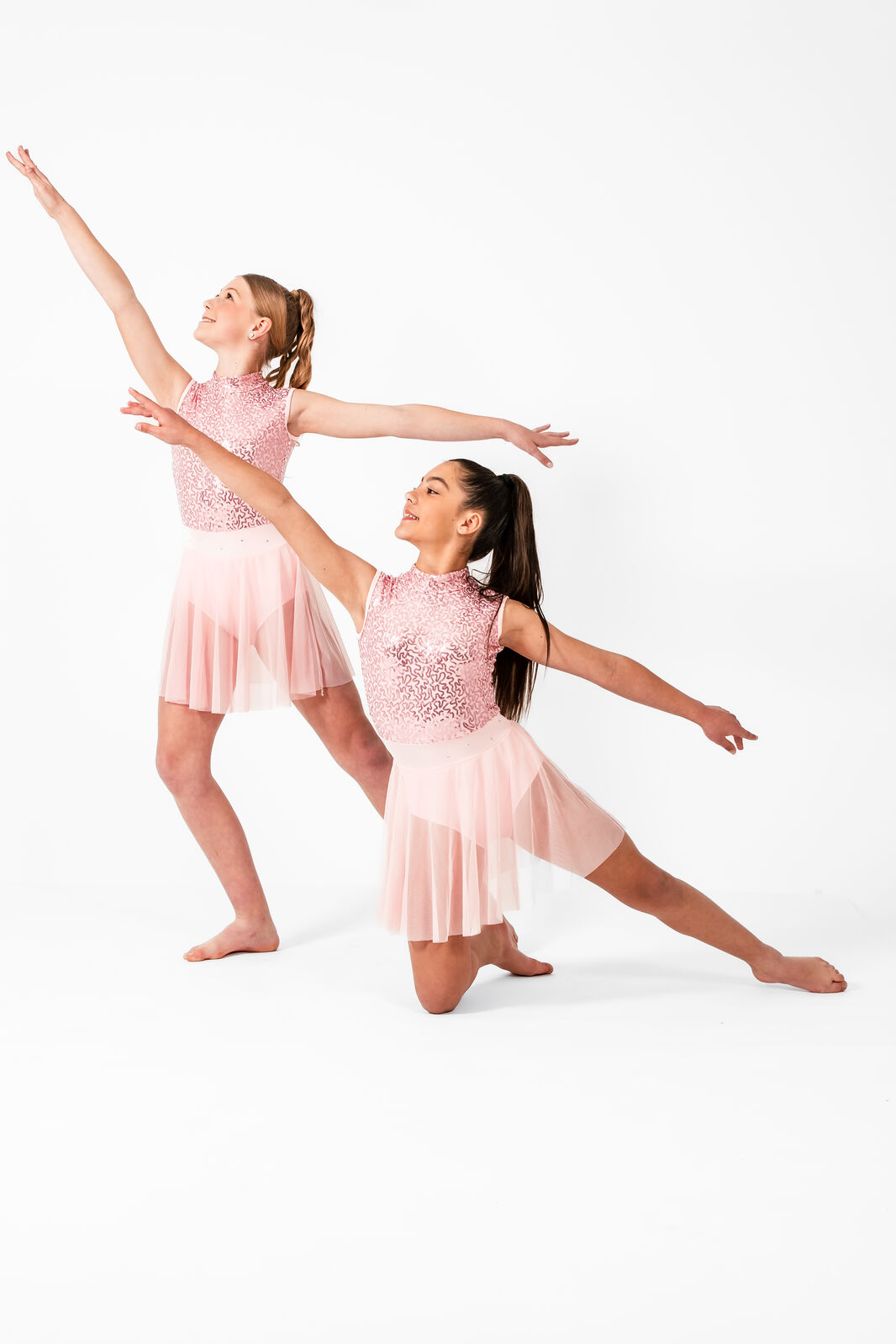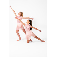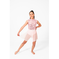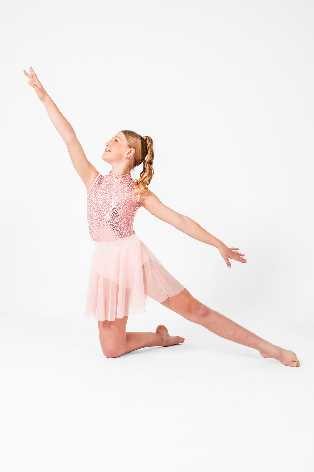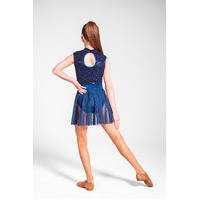 This beautiful costume has a high neck leotard with a sequin bodice and mesh inserts at the waist embellished with sparkling rhinestones. It also has an attached mid thigh length skirt and a keyhole back with neck fastening.