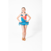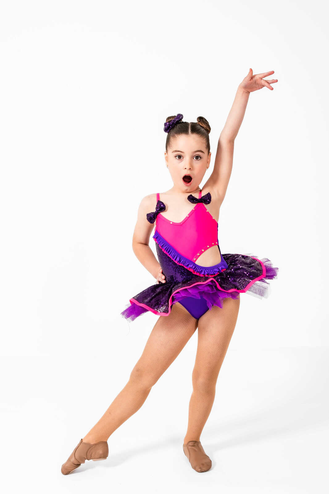 Sequin and spandex leotard features a two toned asymmetrical ruffle with waist cut out, rhinestone embellishments and two shoulder straps with sequin bows. Attached skirt is layers of tulle with a sequin overlay with ribbon edging. Includes matching sparkly bow hairpiece.
