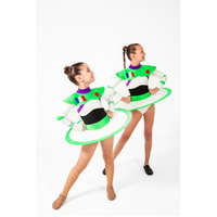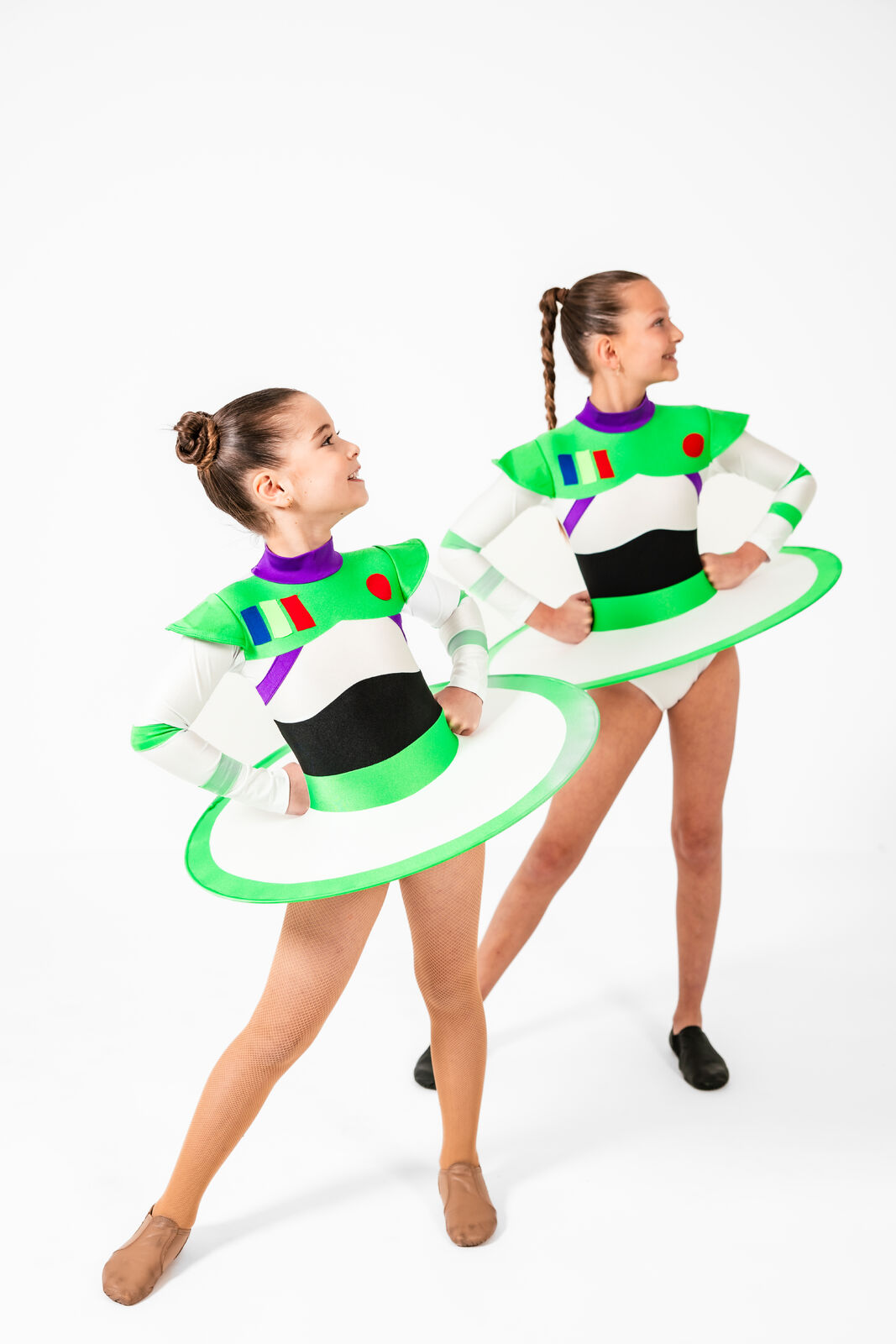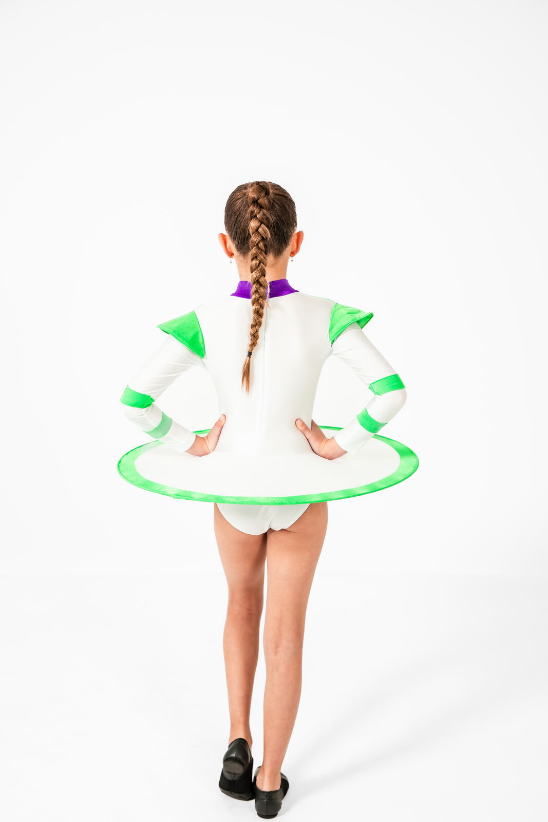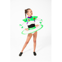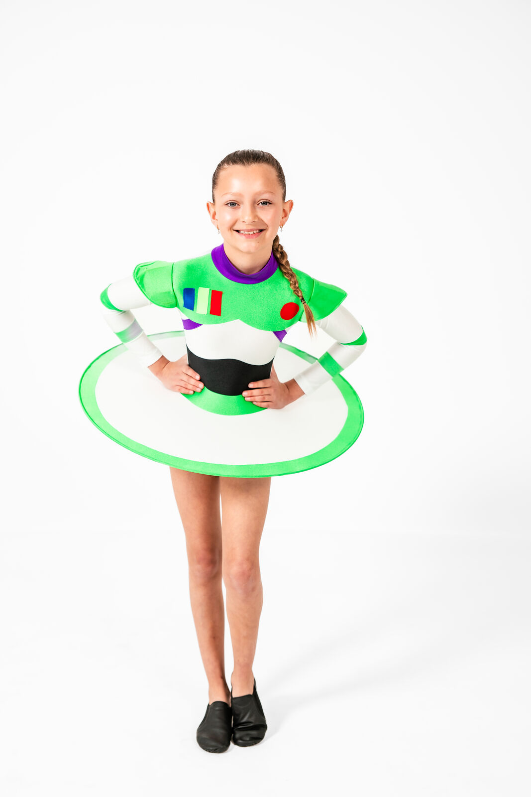 Blast off into dance adventures with our Space Ranger Leotard Dress! This playful ensemble features a pancake skirt and is decorated just like everyone's favorite space ranger. With a convenient zip-up back, it's perfect for quick costume changes. Get ready to soar through the galaxy and dance your way to infinity and beyond in style!